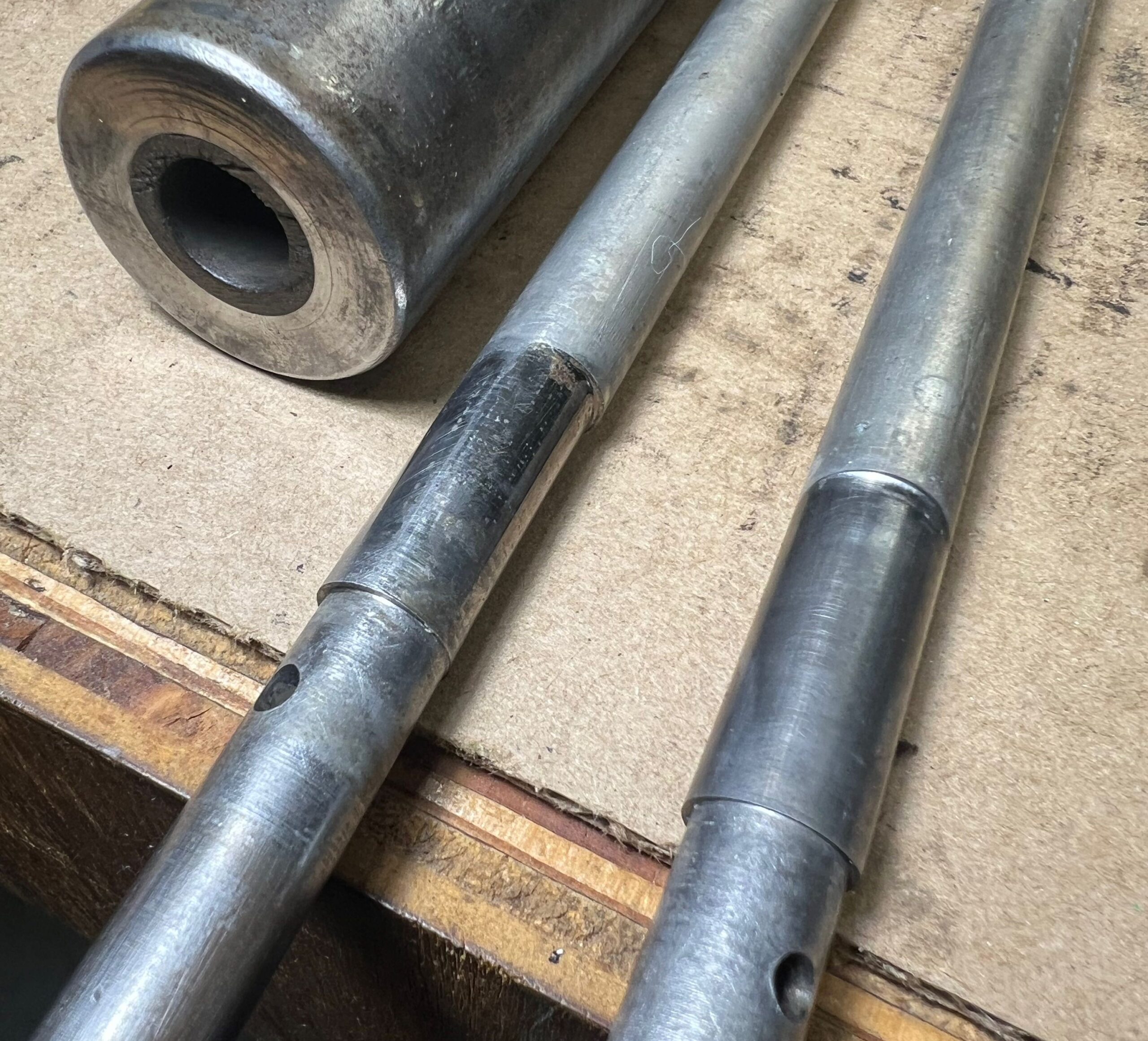 The end of the tie rod on which the rider and bushings turn could be bent, and the outside diameter where the bushing turns can also be worn. New MR-113 tie rods can be made by a machinist, who would turn the rod stock and drill and ream to fit the handles.