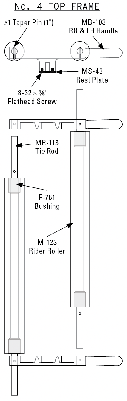 Congratulations on acquiring your press. The No. 4 has framed form rollers, so the roller height must be adjusted in small increments front and back on each side. Keeping the gap between the bearing bars and the frame handles even. Cleaning the assembly will make a difference. The rubber form roller diameter should be 2.5”.