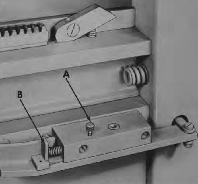 To disengage the automatic gripper function, roll the carriage forward, then push latch “B” toward the assembly block and push down on pin “A’ to lock the latch. Grippers will now raise via the pedal.